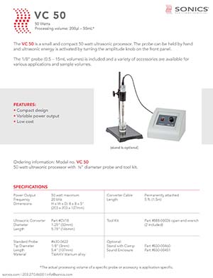 SONICS 超聲波破碎儀 VC 50:是一款小型緊湊的50瓦超聲波處理器。可以用手握住探頭,轉(zhuǎn)動前面板上的振幅旋鈕即可激活超聲波能量。包括1/8“探頭(0.5–15mL體積),并提供各種配件,用于各種應用和樣品體積。