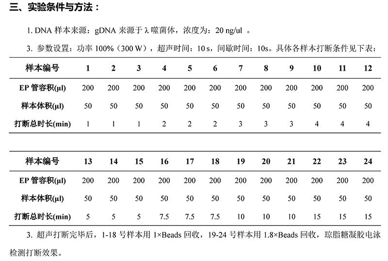 實驗?zāi)康模?br/>1. 測試在100%功平(300W), 超聲時間:lO s, 間歇時間:1Os, 50ul打斷條件下, 不同目的片段大小對應(yīng)的打斷時間。